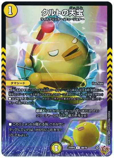 G・ストライク(このカードを自分のシールドゾーンから手札に加える時、表向きにし、相手のクリーチャーを1体選んでもよい。このターン、そのクリーチャーは攻撃できない)シンカライズ(このタマシードがクリーチャーであるかのように、この上に進化クリーチャーを置いてもよい)~超魂X(これがクリーチャーの下にあれば、そのクリーチャーにも以下の能力を与える)~このエレメントが離れる時、これがアンタップしていれば、かわりにこれをタップしてもよい。