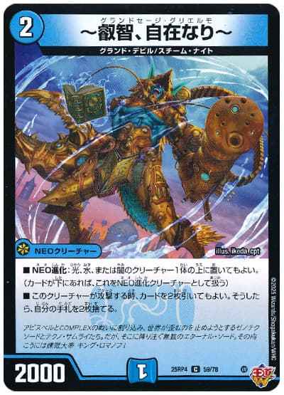 NEO進化:光、水、または闇のクリーチャー1体の上に置いてもよい。(カードが下にあれば、これをNEO進化クリーチャーとして扱う)このクリーチャーが攻撃する時、カードを2枚引いてもよい。そうしたら、自分の手札を2枚捨てる。