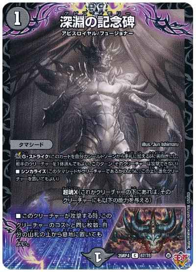 G・ストライク(このカードを自分のシールドゾーンから手札に加える時、表向きにし、相手のクリーチャーを1体選んでもよい。このターン、そのクリーチャーは攻撃できない)シンカライズ(このタマシードがクリーチャーであるかのように、この上に進化クリーチャーを置いてもよい)~超魂X(これがクリーチャーの下にあれば、そのクリーチャーにも以下の能力を与える)~このクリーチャーが攻撃する時、このクリーチャーのコストと同じ枚数、自分の山札の上から墓地に置いてもよい。