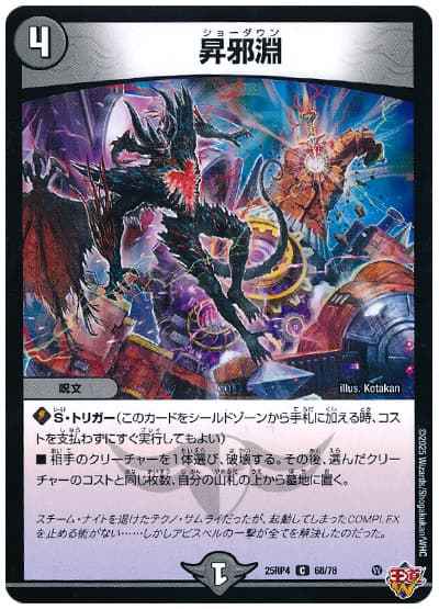 S・トリガー(このカードをシールドゾーンから手札に加える時、コストを支払わずにすぐ実行してもよい)相手のクリーチャーを1体選び、破壊する。その後、選んだクリーチャーのコストと同じ枚数、自分の山札の上から墓地に置く。