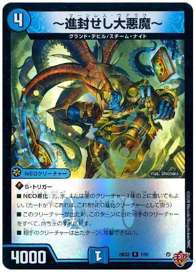 S・トリガーNEO進化:光、水、または闇のクリーチャーの1体の上に置いてもよい。(カードが下にあれば、これをNEO進化クリーチャーとして扱う)このクリーチャーが出た時、このターンに出た相手のクリーチャーをすべて、持ち主の手札に戻す。相手のクリーチャーは出たターン、攻撃できない。