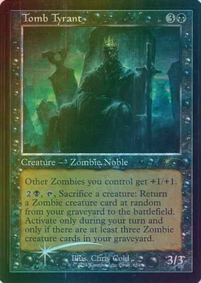 (2)(黒),(T),クリーチャー1体を生け贄に捧げる:あなたの墓地にあるゾンビ・クリーチャー・カード1枚を無作為に選び、戦場に戻す。あなたのターンで、かつ、あなたの墓地に3枚以上のゾンビ・クリーチャー・カードがあるときにのみ起動できる。