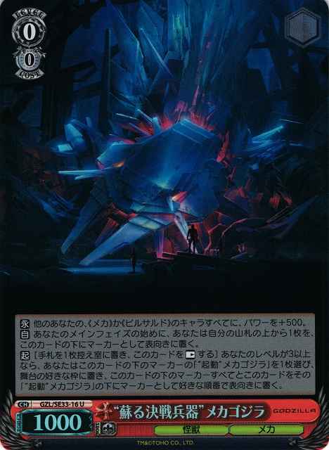 【永】 他のあなたの、《メカ》か《ビルサルド》のキャラすべてに、パワーを+500。 【自】 あなたのメインフェイズの始めに、あなたは自分の山札の上から1枚を、このカードの下にマーカーとして表向きに置く。 【起】[手札を1枚控え室に置き、このカードを【レスト】する] あなたのレベルが3以上なら、あなたはこのカードの下のマーカーの「“起動"メカゴジラ」を1枚選び、舞台の好きな枠に置き、このカードの下のマーカーすべてとこのカードをその「“起動"メカゴジラ」の下にマーカーとして好きな順番で表向きに置く。
