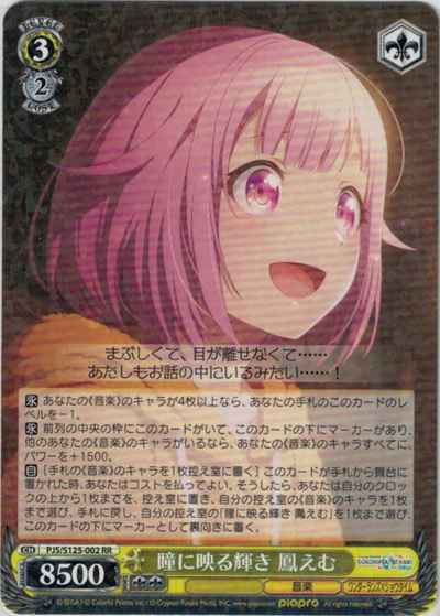 【永】 あなたの《音楽》のキャラが4枚以上なら、あなたの手札のこのカードのレベルを-1。 【永】 前列の中央の枠にこのカードがいて、このカードの下にマーカーがあり、他のあなたの《音楽》のキャラがいるなら、あなたの《音楽》のキャラすべてに、パワーを+1500。 【自】[手札の《音楽》のキャラを1枚控え室に置く] このカードが手札から舞台に置かれた時、あなたはコストを払ってよい。そうしたら、あなたは自分のクロックの上から1枚までを、控え室に置き、自分の控え室の《音楽》のキャラを1枚まで選び、手札に戻し、自分の控え室の「瞳に映る輝き 鳳えむ」を1枚まで選び、このカードの下にマーカーとして裏向きに置く。