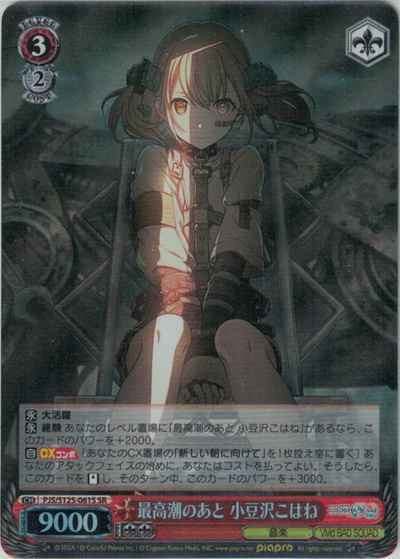【永】 大活躍 【永】 経験 あなたのレベル置場に「最高潮のあと 小豆沢こはね」があるなら、このカードのパワーを+2000。 【自】【CXコンボ】[あなたのCX置場の「新しい朝に向けて」を1枚控え室に置く] あなたのアタックフェイズの始めに、あなたはコストを払ってよい。そうしたら、このカードを【スタンド】し、そのターン中、このカードのパワーを+3000。