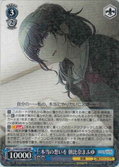 【自】 このカードが手札から舞台に置かれた時か「震える背に優しさを 宵崎奏」の【起】の効果で舞台に置かれた時、あなたは自分の山札を上からX枚まで見て、カードを1枚まで選び、手札に加え、残りのカードを控え室に置く。Xはあなたの《音楽》のキャラの枚数に等しい。 【自】【CXコンボ】[手札を1枚控え室に置く] このカードがアタックした時、CX置場に「何かが違う食卓」があり、他のあなたの《音楽》のキャラが2枚以上なら、あなたはコストを払ってよい。そうしたら、あなたは相手の山札を上から3枚まで見て、トリガーアイコンにソウルがあるカードを3枚まで選び、クロック置場に好きな順番で置き、残りのカードを控え室に置く。