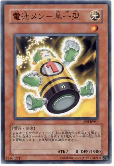 このカードが自分フィールド上に表側表示で存在する限り、相手は自分フィールド上に存在する「電池メン-単一型」以外の雷族モンスターを攻撃対象に選択できない。
