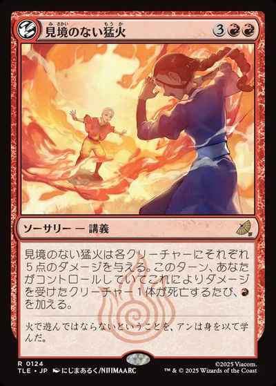見境のない猛火は各クリーチャーにそれぞれ5点のダメージを与える。このターン、あなたがコントロールしていてこれによりダメージを受けたクリーチャー1体が死亡するたび、(赤)を加える。
