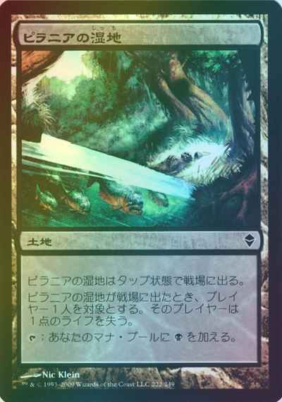 ピラニアの湿地はタップ状態で戦場に出る。 ピラニアの湿地が戦場に出たとき、プレイヤー1人を対象とする。そのプレイヤーは1点のライフを失う。 (T):あなたのマナ・プールに(黒)を加える。