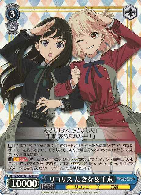 【自】[手札を1枚控え室に置く] このカードが手札から舞台に置かれた時、あなたはコストを払ってよい。そうしたら、あなたは自分のクロックの上から1枚を、ストック置場に置く。【自】【CXコンボ】[(2)] このカードがアタックした時、クライマックス置場に「力を合わせて」があるなら、あなたはコストを払ってよい。そうしたら、相手に2ダメージを与える。(ダメージキャンセルは発生する)