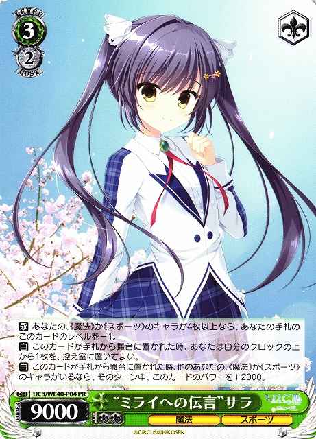 【永】 あなたの、《魔法》か《スポーツ》のキャラが4枚以上なら、あなたの手札のこのカードのレベルを-1。 【自】 このカードが手札から舞台に置かれた時、あなたは自分のクロックの上から1枚を、控え室に置いてよい。 【自】 このカードが手札から舞台に置かれた時、他のあなたの、《魔法》か《スポーツ》のキャラがいるなら、そのターン中、このカードのパワーを+2000。