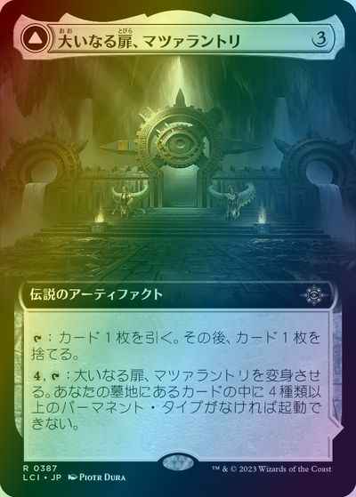 (T):カード1枚を引く。その後、カード1枚を捨てる。 (4),(T):大いなる扉、マツァラントリを変身させる。あなたの墓地にあるカードの中に4種類以上のパーマネント・タイプがなければ起動できない。(「アーティファクト」「バトル」「クリーチャー」「エンチャント」「土地」「プレインズウォーカー」はパーマネント・タイプである。)/(《大いなる扉、マツァラントリ/Matzalantli, the Great Door》から変身する。) 底なしの落魄 ― (T):好きな色1色のマナX点を加える。Xは、あなたの墓地にあるパーマネント・カードの枚数に等しい。