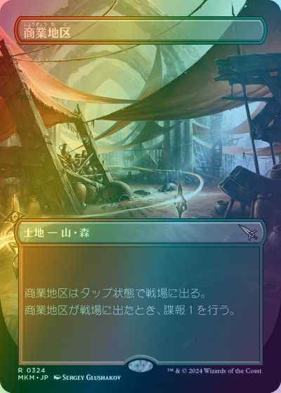 ((T):(赤)か(緑)を加える。) 商業地区はタップ状態で戦場に出る。 商業地区が戦場に出たとき、諜報1を行う。(あなたのライブラリーの一番上にあるカード1枚を見る。それをあなたの墓地に置いてもよい。)