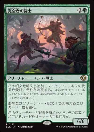 この呪文を唱える追加コストとして、エルフ(Elf)の後見を受けてそれを追放する。(あなたがコントロールしているエルフ1つか、あなたの手札にあるエルフ・カード1枚を追放する。) あなたがクリーチャー呪文1つを唱えるたび、カード1枚を引く。 このクリーチャーが戦場を離れたとき、その追放されているカードをオーナーの手札に戻す。 6/6