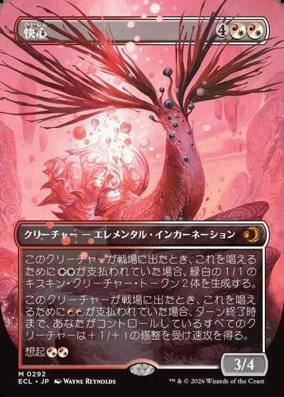 このクリーチャーが戦場に出たとき、これを唱えるために(赤)(赤)が支払われていた場合、ターン終了時まで、あなたがコントロールしているすべてのクリーチャーは+1/+1の修整を受け速攻を得る。
