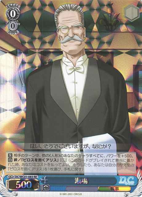 【永】 相手のターン中、他の《人形》のあなたのキャラすべてに、パワーを+500。 【自】 絆/「ピロスを抱くアリス」 [(1)] (このカードがプレイされて舞台に置かれた時、あなたはコストを払ってよい。そうしたら、あなたは自分の控え室の「ピロスを抱くアリス」を1枚選び、手札に戻す)