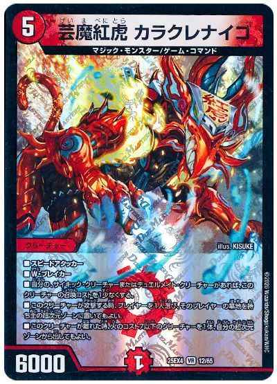 スピードアタッカーW・ブレイカー自分の、サイキック・クリーチャーまたはデュエルメイト・クリーチャーがあれば、このクリーチャーの召喚コストを1少なくする。このクリーチャーが攻撃する時、プレイヤーを1人選び、そのプレイヤーの墓地を持ち主の超次元ゾーンに置いてもよい。このクリーチャーが離れた時、火のコスト7以下のクリーチャーを1体、自分の超次元ゾーンから出してもよい。