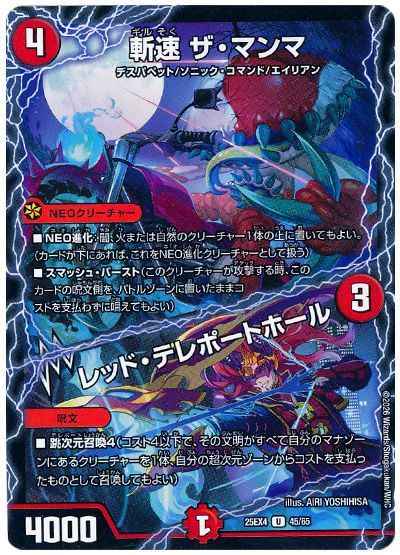 NEO進化:闇、火、または自然のクリーチャー1体の上に置いてもよい。(カードが下にあれば、これをNEO進化クリーチャーとして扱う)スマッシュ・バースト(このクリーチャーが攻撃する時、このカードの呪文側を、バトルゾーンに置いたままコストを支払わずに唱えてもよい)