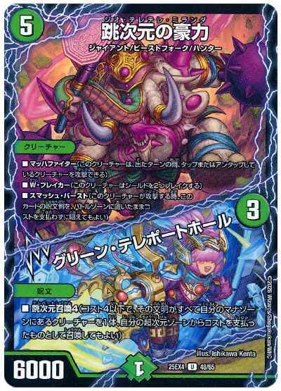 マッハファイター(このクリ―チャーは、出たターン間、タップまたはアンタップしているクリーチャーを攻撃できる)W・ブレイカー(このクリーチャーはシールドを2つブレイクする)スマッシュ・バースト(このクリーチャーが攻撃する時、このカードの呪文側を、バトルゾーンに置いたままコストを支払わずに唱えてもよい)