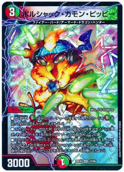 D・D・D[火/自然(5)](自分のクリーチャーが攻撃する時、このカードを[火/自然(5)]支払って自分の手札から実行してもよい)このクリーチャーが出た時、自分の山札の上から2枚をマナゾーンに置き、その後、カードを1枚、自分のマナゾーンから超次元ゾーンに置く。このクリーチャーが「D・D・D」によって出た時、跳次元召喚6する。(コスト6以下で、その文明がすべて自分のマナゾーンにあるクリーチャーを1体、自分の超次元ゾーンからコストを支払ったものとして召喚してもよい)