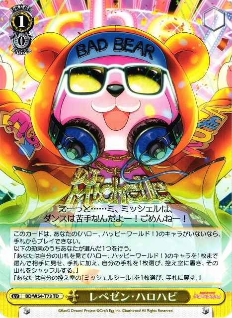 このカードは、あなたの《ハロー、ハッピーワールド!》のキャラがいないなら、手札からプレイできない。 以下の効果のうちあなたが選んだ1つを行う。 『あなたは自分の山札を見て《ハロー、ハッピーワールド!》のキャラを1枚まで選んで相手に見せ、手札に加え、自分の手札を1枚選び、控え室に置き、その山札をシャッフルする。』 『あなたは自分の控え室の「ミッシェルシール」を1枚選び、手札に戻す。』