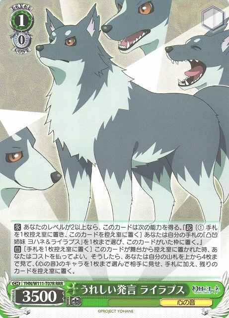【永】 あなたのレベルが2以上なら、このカードは次の能力を得る。『【起】[(1) 手札を1枚控え室に置き、このカードを控え室に置く] あなたは自分の手札の「凸凹姉妹 ヨハネ&ライラプス」を1枚まで選び、このカードがいた枠に置く。』【自】[手札を1枚控え室に置く] このカードが舞台から控え室に置かれた時、あなたはコストを払ってよい。そうしたら、あなたは自分の山札を上から4枚まで見て、《心の音》のキャラを1枚まで選んで相手に見せ、手札に加え、残りのカードを控え室に置く。