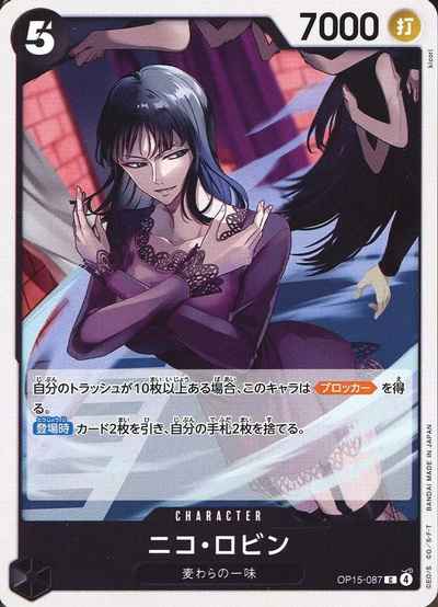 自分のトラッシュが10枚以上ある場合、このキャラは【ブロッカー】を得る。 【登場時】カード2枚を引き、自分の手札2枚を捨てる。