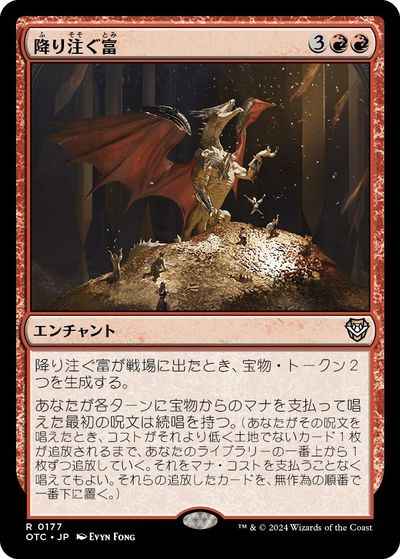 降り注ぐ富が戦場に出たとき、宝物(Treasure)トークン2つを生成する。 あなたが各ターンに宝物からのマナを支払って唱えた最初の呪文は続唱を持つ。(あなたがその呪文を唱えたとき、コストがそれより低く土地でないカード1枚が追放されるまで、あなたのライブラリーの一番上から1枚ずつ追放していく。あなたはそれをマナ・コストを支払うことなく唱えてもよい。それらの追放されているカードをあなたのライブラリーの一番下に無作為の順番で置く。)