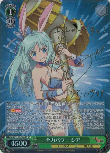 【自】 このカードが手札から舞台に置かれた時、そのターン中、このカードのパワーを+1500。 【自】【CXコンボ】 このカードがアタックした時、クライマックス置場に「ただのウサミミ少女ですっ!」があり、他のあなたの《トータス》のキャラが2枚以上なら、あなたは自分の山札の上から2枚を、控え室に置き、自分の控え室のレベルX以下の《トータス》のキャラを1枚まで選び、手札に戻す。選んだキャラのレベルが3以上なら、そのターン中、このカードのパワーを+3000。Xはこの効果で控え室に置かれたカードのレベルの合計に等しい。(クライマックスのレベルは0として扱う)