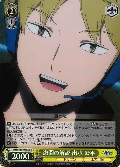【自】 あなたのキャラのトリガーチェックでトリガーアイコンにソウルがあるカードがでた時、あなたは1枚引いてよい。そうしたら、あなたは自分の手札を1枚選び、控え室に置く。 【起】[このカードを【レスト】する] あなたは自分の《トリオン》のキャラを1枚選び、そのターン中、パワーを+3000。 【起】[(2) このカードを【レスト】する] あなたは相手のキャラを1枚選び、手札に戻す。