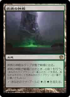 疾病の神殿はタップ状態で戦場に出る。 疾病の神殿が戦場に出たとき、占術1を行う。(あなたのライブラリーの一番上のカードを見る。あなたはそのカードをあなたのライブラリーの一番下に置いてもよい。) (T):あなたのマナ・プールに(黒)か(緑)を加える。
