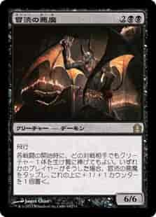 飛行 各戦闘の開始時に、いずれの対戦相手もクリーチャーを1体生け贄に捧げてもよい。プレイヤー1人がそうした場合、冒涜の悪魔をタップし、これの上に+1/+1カウンターを1個置く。
