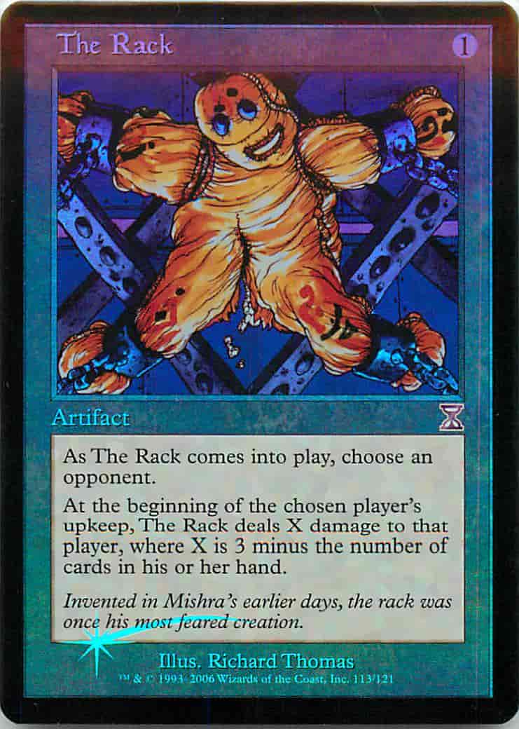 As The Rack enters the battlefield, choose an opponent. At the beginning of the chosen player's upkeep, The Rack deals X damage to that player, where X is 3 minus the number of cards in their hand.