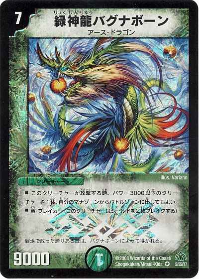このクリーチャーが攻撃する時、パワー3000以下のクリーチャーを1体、自分のマナゾーンからバトルゾーンに出してもよい。W・ブレイカー(このクリーチャーはシールドを2枚ブレイクする)戦場で散った誇りある魂は、バグナボーンによって導かれる。