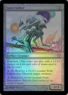 Sunburst (This enters the battlefield with a +1/+1 counter on it for each color of mana spent to cast it.) {4}, {T}, Remove a +1/+1 counter from Suncrusher: Destroy target creature. {2}, Remove a +1/+1 counter from Suncrusher: Return Suncrusher to its owner's hand.