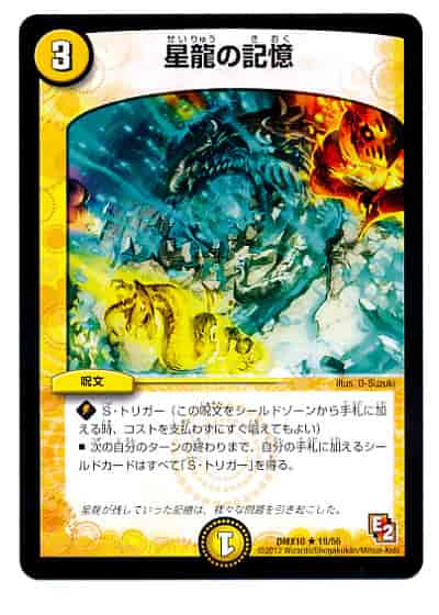 S・トリガー(この呪文をシールドゾーンから手札に加える時、コストを支払わずにすぐ唱えてもよい)次の自分のターンの終わりまで、自分の手札に加えるシールドカードはすべて「S・トリガー」を得る。星龍が残していった記憶は、様々な問題を引き起こした。