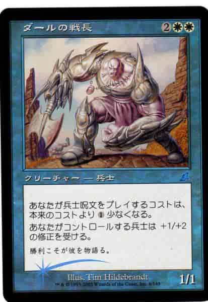 あなたが唱える兵士(Soldier)呪文は、それを唱えるためのコストが(1)少なくなる。 あなたがコントロールする兵士クリーチャーは+1/+2の修整を受ける。