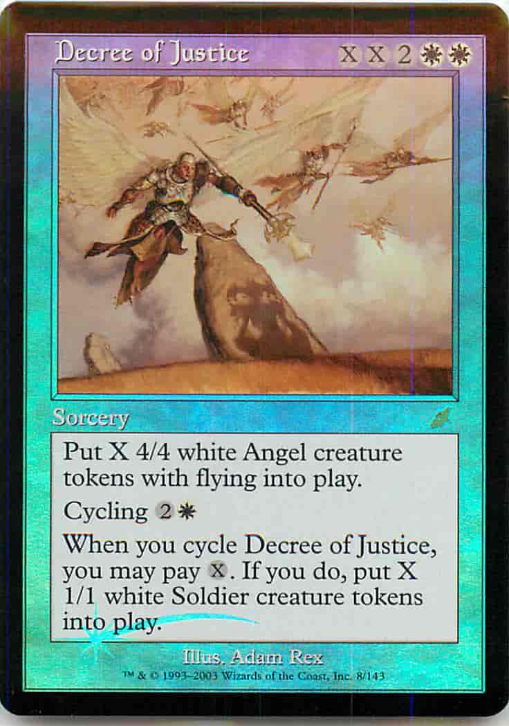白の4/4の飛行を持つ天使(Angel)クリーチャー・トークンをX体生成する。 サイクリング(2)(白)((2)(白),このカードを捨てる:カードを1枚引く。) あなたが正義の命令をサイクリングしたとき、あなたは(X)を支払ってもよい。そうした場合、白の1/1の兵士(Soldier)クリーチャー・トークンをX体生成する。