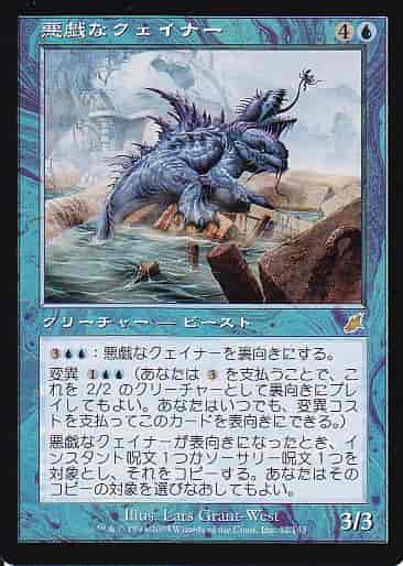 (3)(青)(青):悪戯なクェイナーを裏向きにする。 変異(1)(青)(青)(あなたはこのカードを、(3)で2/2クリーチャーとして裏向きに唱えてもよい。これの変異コストで、これをいつでも表向きにしてもよい。) 悪戯なクェイナーが表向きになったとき、インスタント呪文1つかソーサリー呪文1つを対象とし、それをコピーする。あなたはそのコピーの新たな対象を選んでもよい。