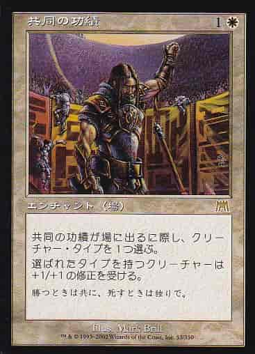 共同の功績が戦場に出るに際し、クリーチャー・タイプを1種類選ぶ。 選ばれたタイプを持つクリーチャーは、+1/+1の修整を受ける。