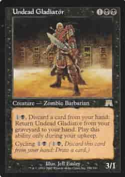 (1)(黒),カードを1枚捨てる:あなたの墓地にあるアンデッドの剣闘士をあなたの手札に戻す。この能力は、あなたのアップキープの間にのみ起動できる。 サイクリング(1)(黒)((1)(黒),このカードを捨てる:カードを1枚引く。)