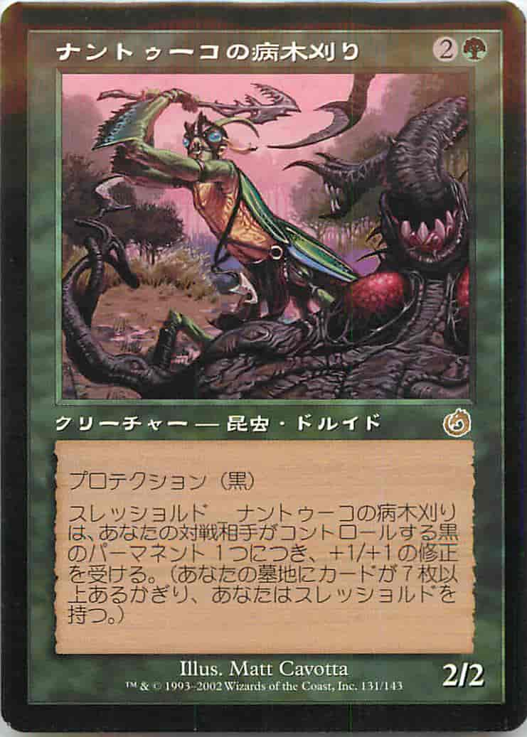 プロテクション(黒) スレッショルド ― あなたの墓地にカードが7枚以上あるかぎり、ナントゥーコの病木刈りは、あなたの対戦相手がコントロールする黒のパーマネント1つにつき+1/+1の修整を受ける。