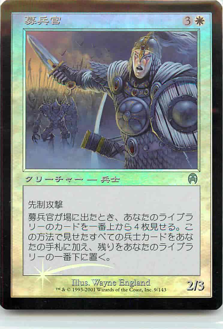 先制攻撃 募兵官が戦場に出たとき、あなたのライブラリーのカードを一番上から4枚公開する。これにより公開されたすべての兵士(Soldier)カードをあなたの手札に加え、残りをあなたのライブラリーの一番下に望む順番で置く。