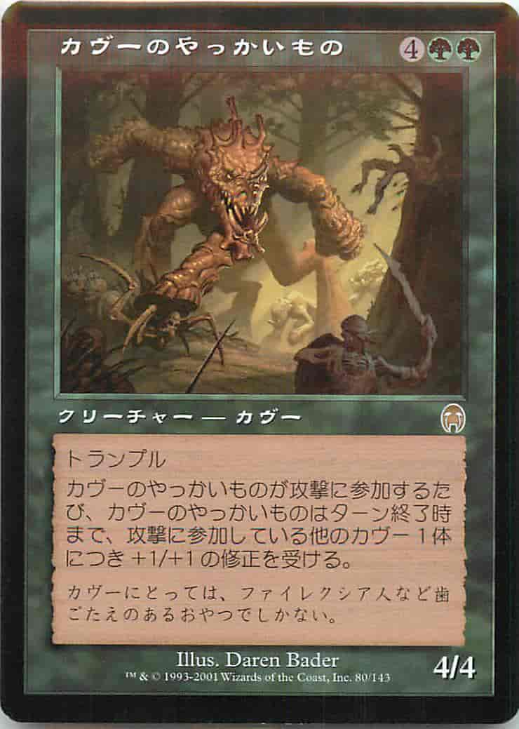 トランプル カヴーのやっかいものが攻撃するたび、カヴーのやっかいものはターン終了時まで、他の攻撃しているカヴー(Kavu)1体につき+1/+1の修整を受ける。