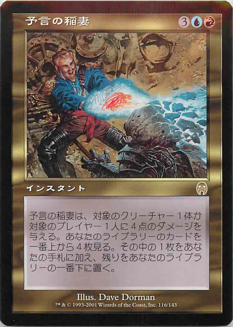 クリーチャー1体かプレイヤー1人を対象とする。予言の稲妻は、それに4点のダメージを与える。あなたのライブラリーのカードを上から4枚見る。それらのカードの中から1枚を選び、それをあなたの手札に加える。残りをあなたのライブラリーの一番下に望む順番で置く。
