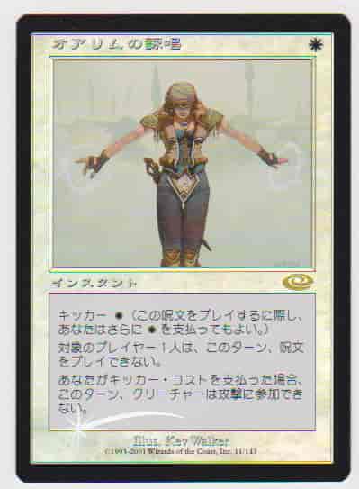 キッカー(白)(あなたがこの呪文を唱えるに際し、あなたは追加の(白)を支払ってもよい。) プレイヤー1人を対象とする。このターン、そのプレイヤーは呪文を唱えられない。 オアリムの詠唱がキッカーされていた場合、このターン、クリーチャーは攻撃できない。