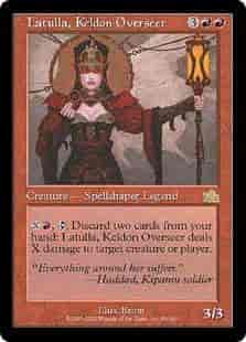 (X)(赤),(T),カードを2枚捨てる:クリーチャー1体かプレイヤー1人を対象とする。ケルドの軍監ラトゥーラは、それにX点のダメージを与える。