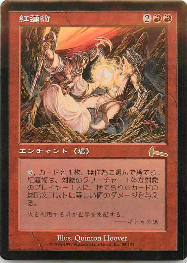 (3),カードを1枚無作為に選んで捨てる:クリーチャー1体かプレイヤー1人を対象とする。紅蓮術はそれに、捨てられたカードの点数で見たマナ・コストに等しい点数のダメージを与える。