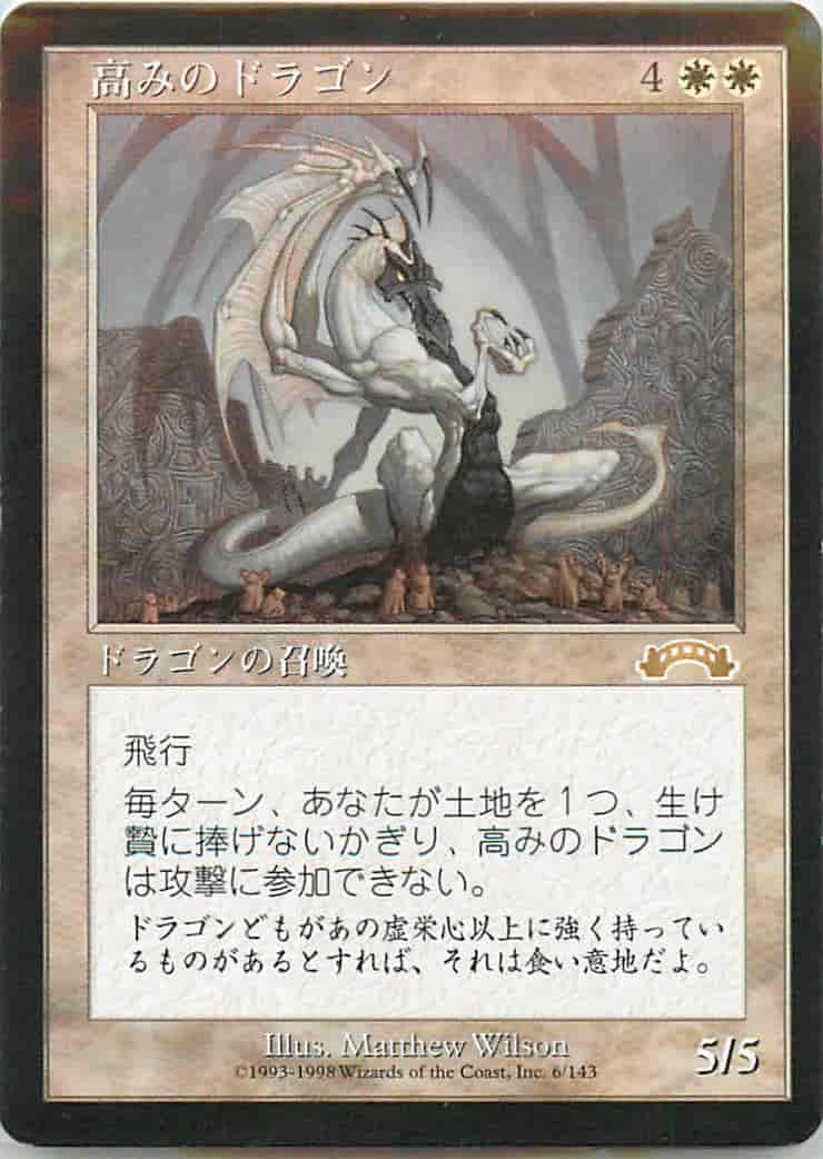 飛行 高みのドラゴンは、あなたが土地を1つ生け贄に捧げないかぎり攻撃できない。(このコストは攻撃クリーチャーの宣言時に支払う。)