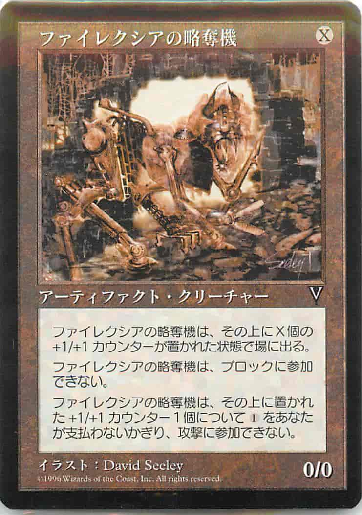 ファイレクシアの略奪機はその上に+1/+1カウンターがX個置かれた状態で戦場に出る。 ファイレクシアの略奪機ではブロックできない。 ファイレクシアの略奪機は、あなたがその上に置かれている+1/+1カウンター1個につき(1)を支払わないかぎり、攻撃できない。
